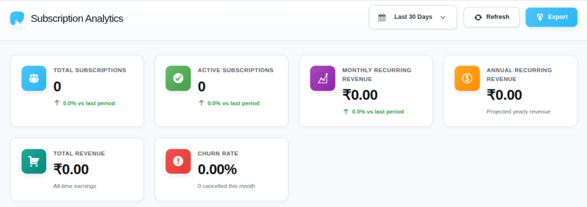 In the Reports section, you can easily view and analyze your subscription data. It provides valuable insights into key metrics such as total subscriptions, subscription revenue, and overall subscription performance. This data empowers you to make informed decisions, helping you optimize and effectively manage your recurring subscriptions and subscription-based revenue.