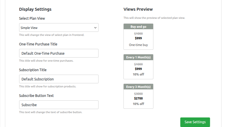 In the Settings section, you can easily customize how subscriptions are displayed on your WooCommerce store. You can define titles for One-Time Purchases and Subscriptions, as well as customize the text for the subscribe button to fit your store’s branding. Additionally, you can choose from different view styles for subscription plans, including options likeLIst View, Card View, Simple View with Radio Buttons, and Select View providing flexibility in how your subscription options are presented to customers.